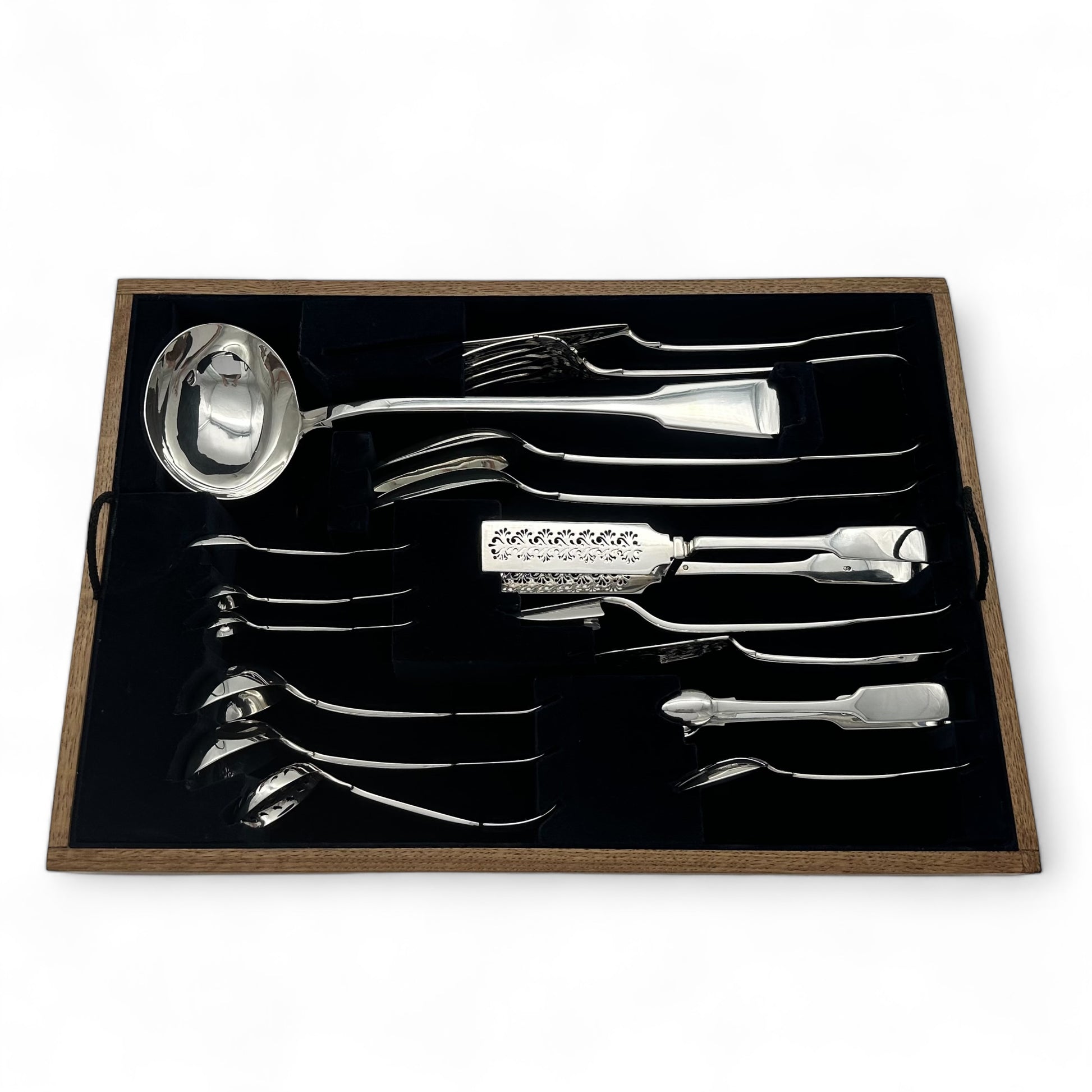 Boxed Antique Silver Fiddle Pattern Cutlery Service for Twelve People.